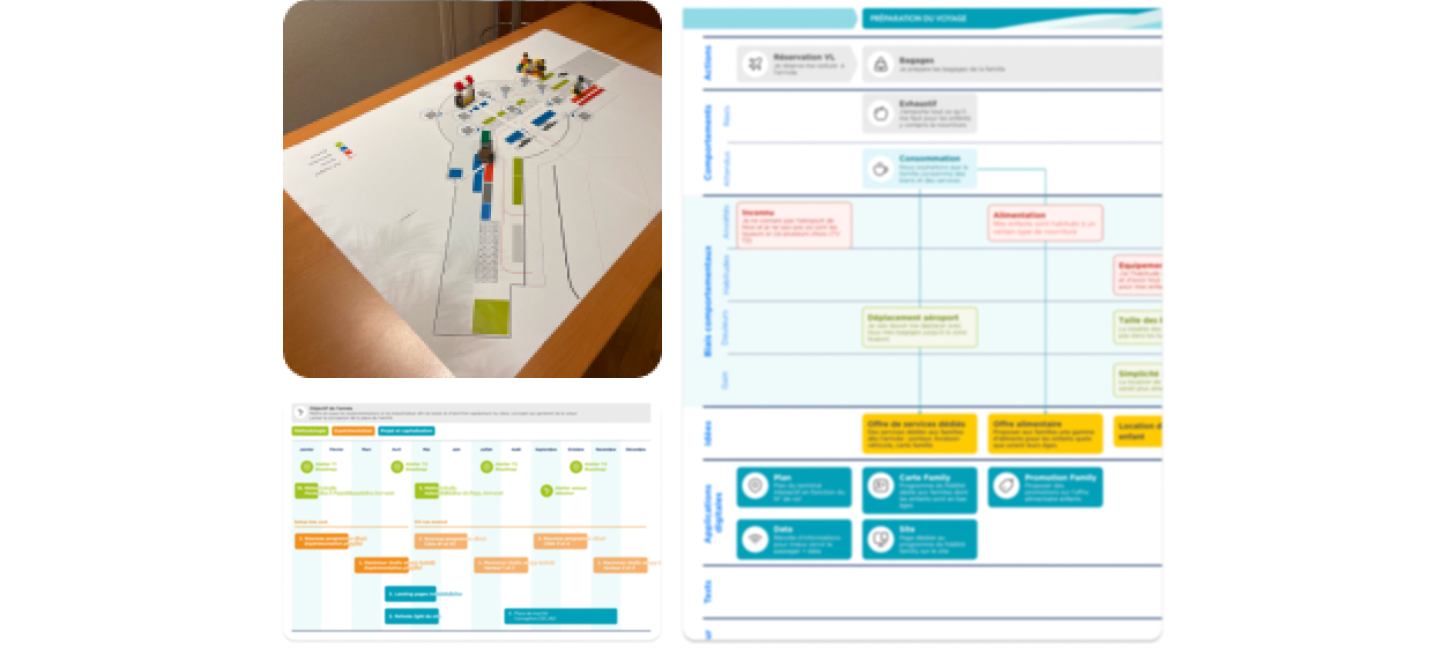 Nous mettons en œuvre, avec 12 employés de l'aéroport, un canvas éprouvé, mais personnalisé, d'idéation fondé à la fois sur le job to be done et la prise de conscience des comportements réels. Et surtout, nous faisons l'atelier dans l'aéroport pour pouvoir aller constater ces comportements, les ré-observer et eventuellement ré-interroger des usagers. Des temps sont aménagés dans l'atelier pour ça.
